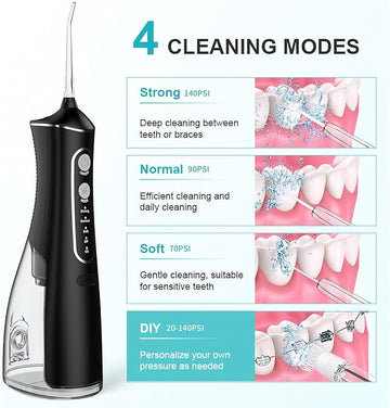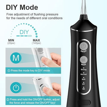 Our oral Irrigator has Strong,Normal,Soft,DIY modes to meet your oral care needs. DIY modes is custom setting mode,which can freely adjust the flushing pressure from 20-140psi. The innovative Memory Function helps keep on with your preferable mode for next use .