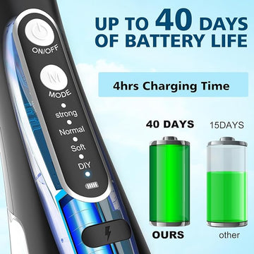 Water dental piks With powerful and environmental battery, fully charged need 4 hours and used continuously for about 40 days. With dual-sealing protection, Our water flosser cordless is leakproof and IPX7 waterproof,ensuring safe use for bathroom or shower. Come with type-C cable,compatible with various charging devices. Perfect for travel and home use!